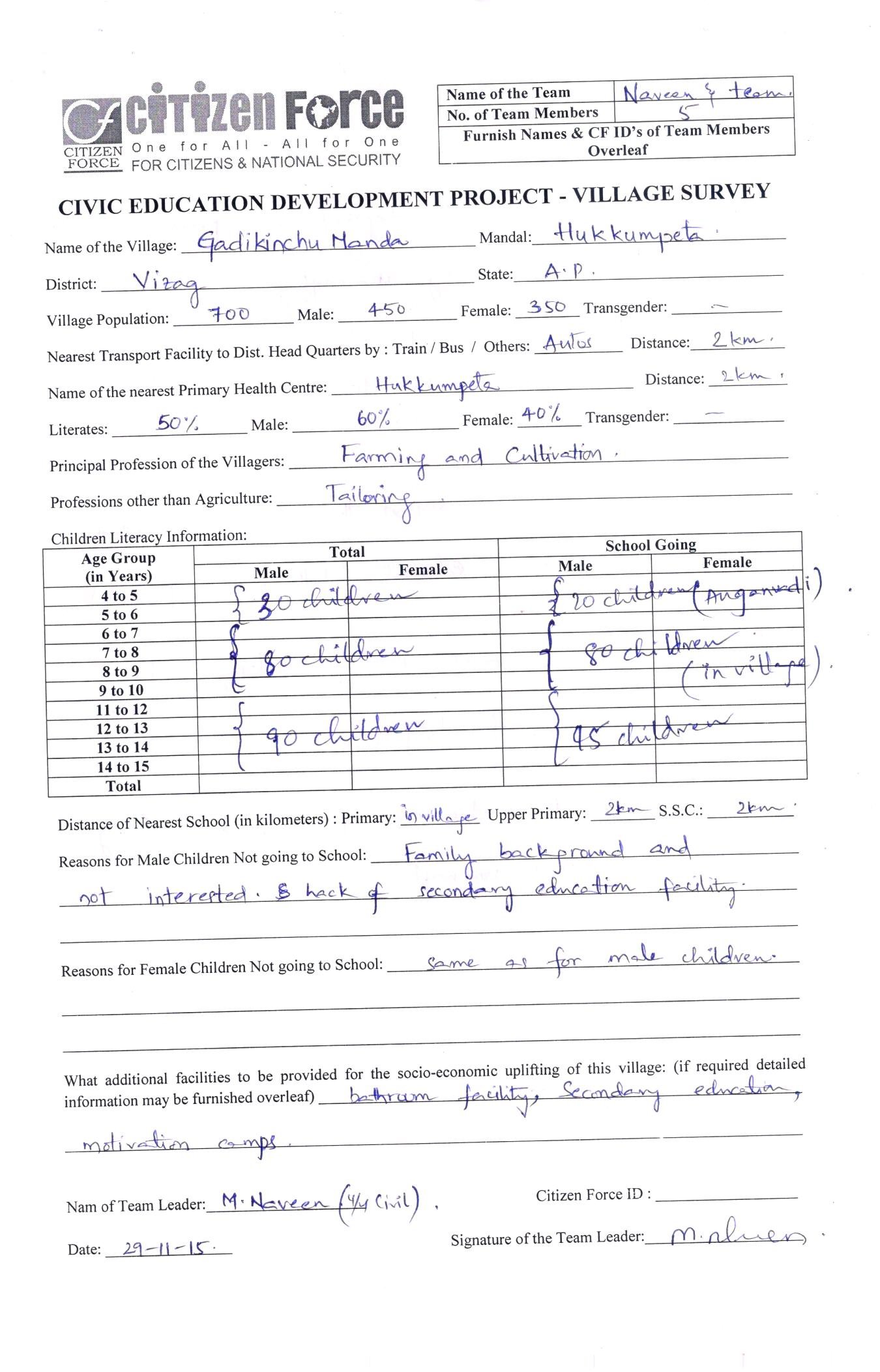 survey reports by BY STUDENT CHAPTER AUCE(A)- GADIKINCHUMANDA VILLAGE HUKUMPETA MANDAL